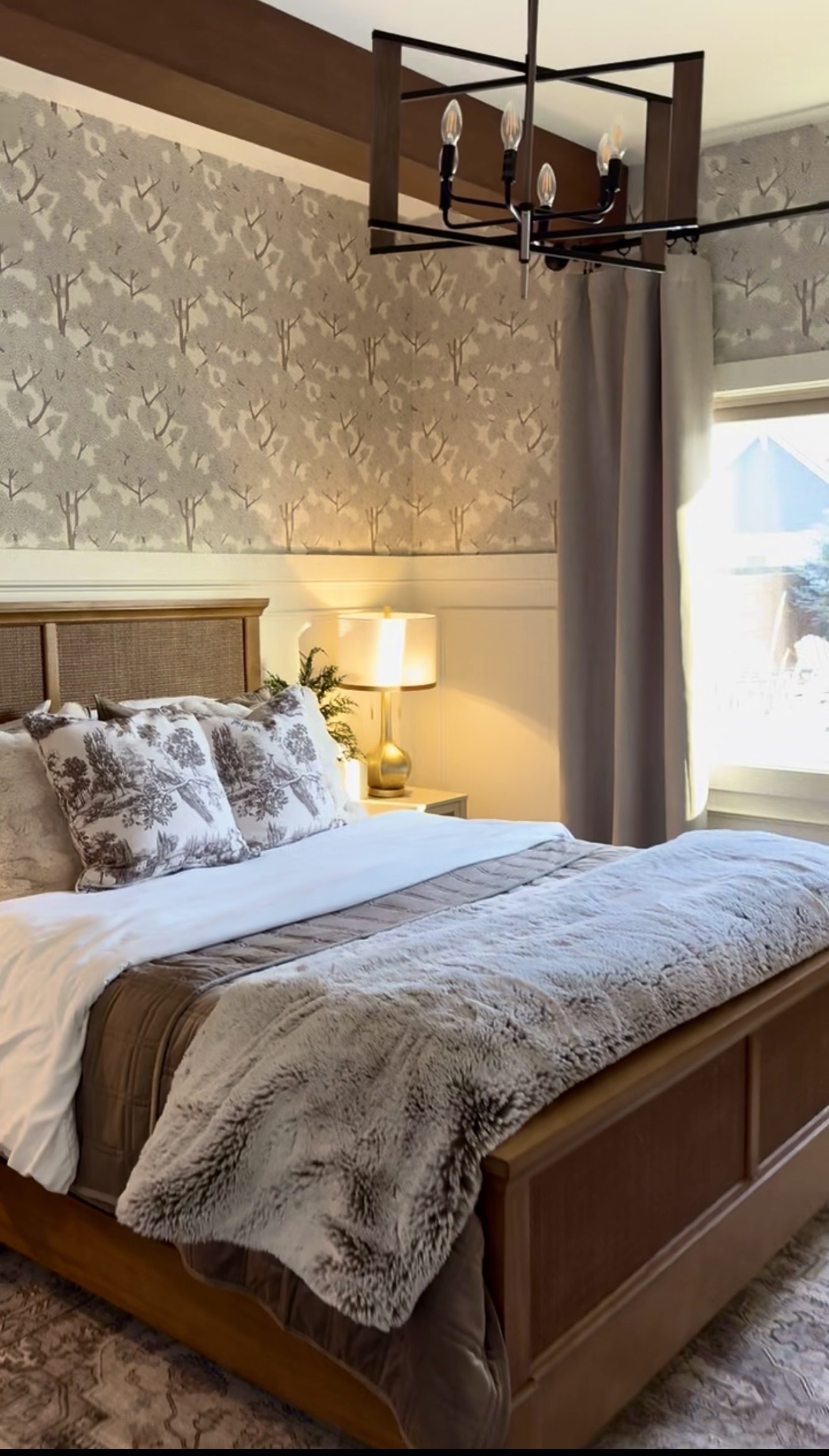Key Materials: Faux Foam Beams, Box Moldings, Peel and Stick Wallpaper, Paint, Drapery, Layered Bedding