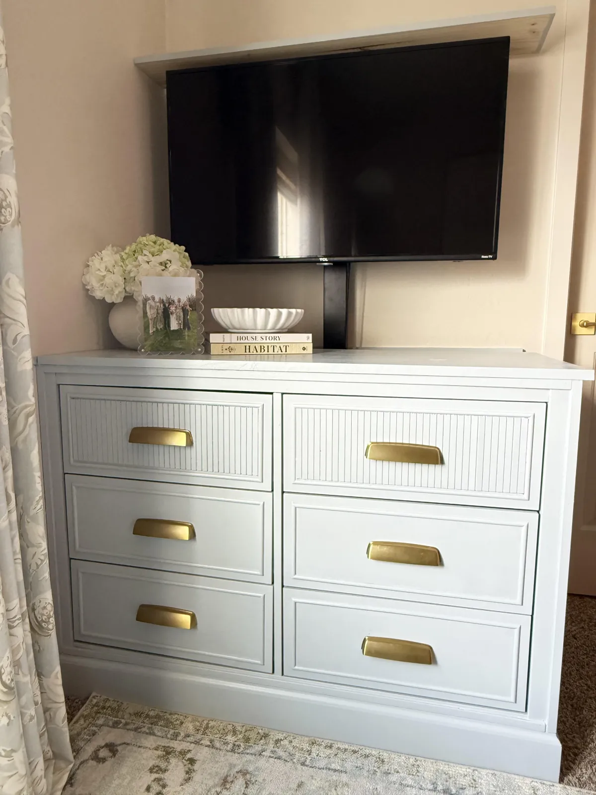 Now the TV stays completely hidden most of the time, and when we want it, it quietly rises up from the dresser. The result is a functional storage piece that looks like custom built in cabinetry while cleverly hiding the TV.