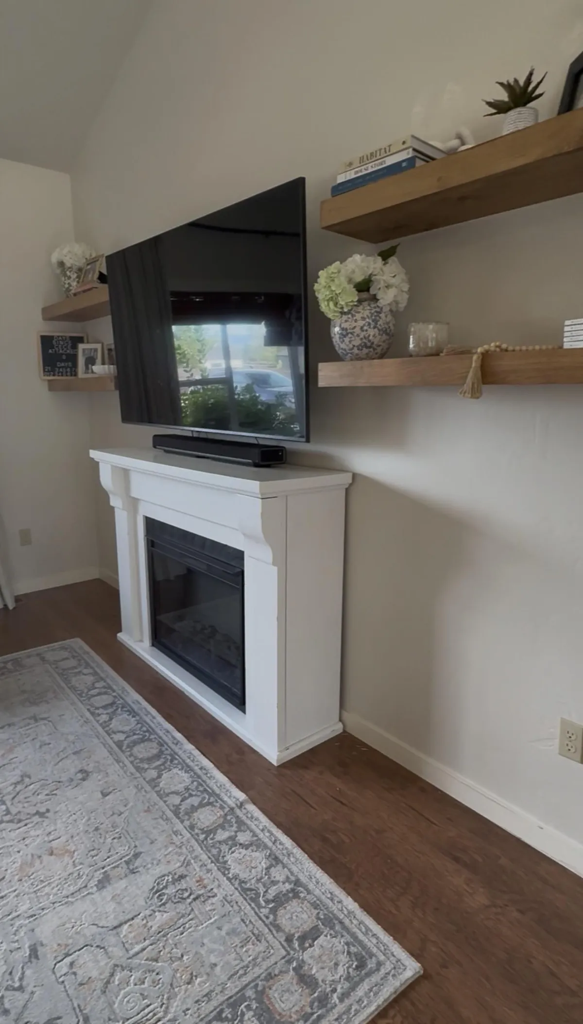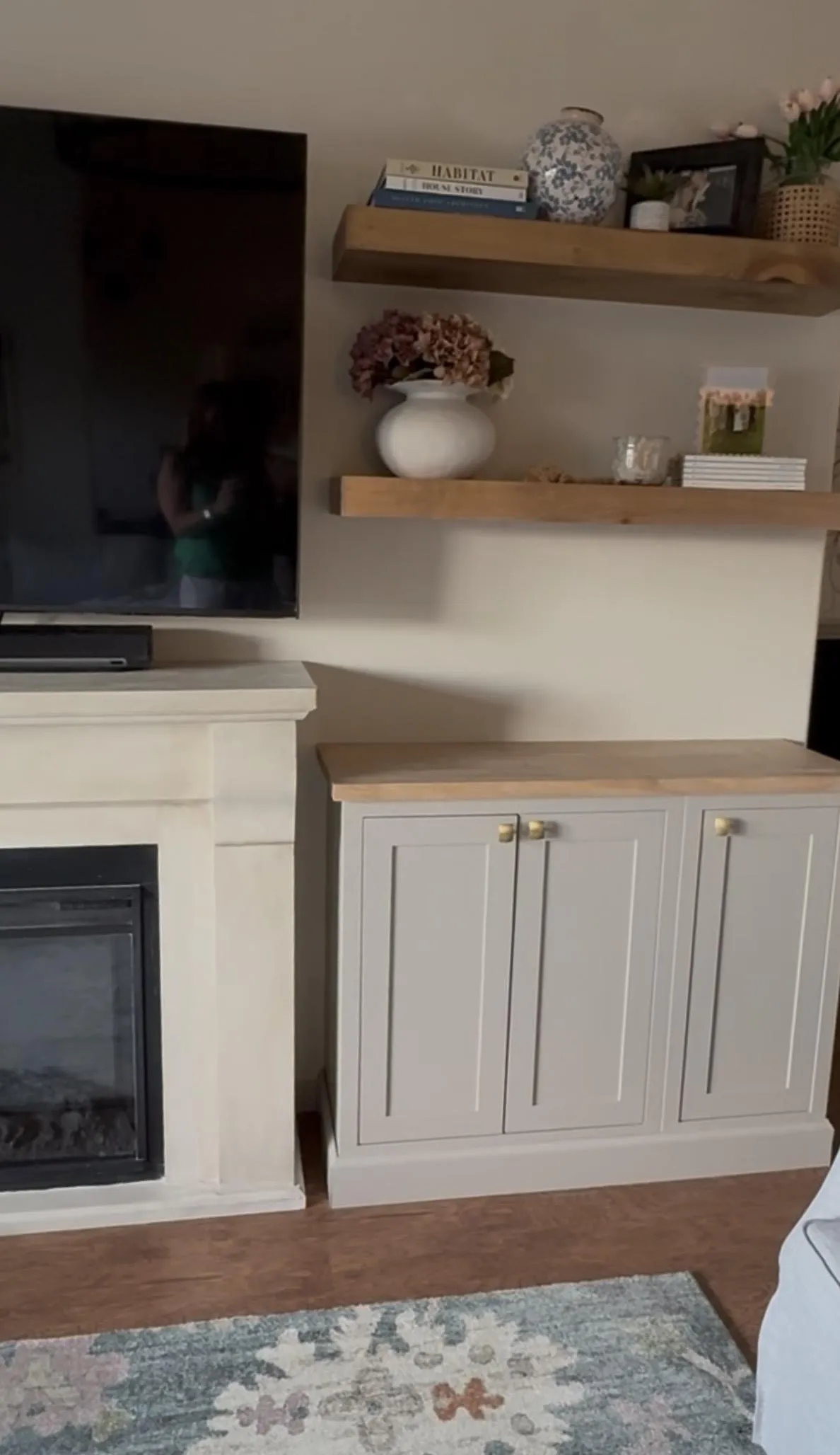 • Repeated the cabinet style near the fireplace to begin building future built in storage